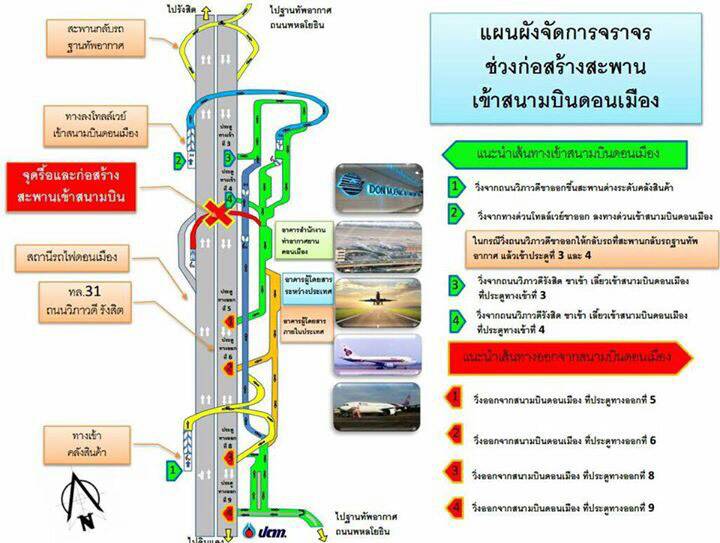 ในระหว่างดำเนินการอาจทำให้การจราจรติดขัด ไม่สะดวกแก่ผู้มาใช้บริการ ท่าอากาศยานดอนเมืองขอแนะนำให้ผู้โดยสาร เผื่อเวลาเดินทางมาที่สนามบินล่วงหน้าอย่างน้อย 3 ชั่วโมง เพื่อป้องกันการพลาดเที่ยวบิน ทั้งนี้ สามารถสอบถามรายละเอียดเพิ่มเติมได้ที่ ศูนย์ประชาสัมพันธ์ ทดม. โทร 0 2535 1192 หรือสายด่วนกรมทางหลวง 1586 (โทรฟรีทุกเครือข่ายตลอด 24 ชั่วโมง)
