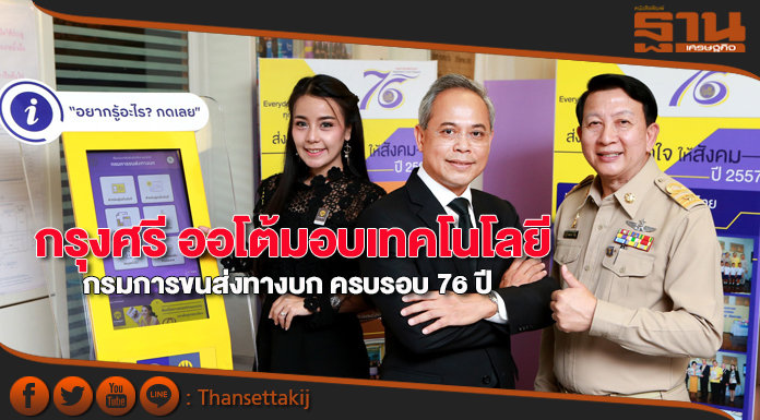 นายไพโรจน์ ชื่นครุฑ ประธานคณะเจ้าหน้าที่ด้านธุรกิจสินเชื่อยานยนต์ ธนาคารกรุงศรีอยุธยา จำกัด (มหาชน) หรือ กรุงศรีออโต้ ผู้ให้บริการสินเชื่อยานยนต์ครบวงจร ได้ส่งมอบระบบคอมพิวเตอร์ทัชสกรีน “สื่อประชาสัมพันธ์อิเล็กทรอนิกส์” ที่ได้รับการอัพเกรดระบบให้ทันสมัยยิ่งขึ้นจำนวน 9 เครื่อง ให้กับกรมการขนส่งทางบก เนื่องในโอกาสครบรอบ 76 ปี วันคล้ายวันสถาปนากรมฯ เพื่อยกระดับการให้บริการ พร้อมอำนวยความสะดวกให้ประชาชนเข้าถึงข้อมูลด้านการต่อทะเบียน ชำระภาษี และทำใบขับขี่ได้อย่างรวดเร็วยิ่งขึ้น โดยมีนายณันทพงศ์ เชิดชู รองอธิบดีกรมการขนส่งทางบก ฝ่ายปฏิบัติการ เป็นผู้รับมอบ