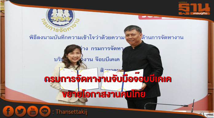 กรมการจัดหางานได้ขยายความร่วมมือกับภาคเอกชน โดยร่วมกับบริษัทจัดหางาน จ๊อบบีเคเค ดอทคอม จำกัด ลงนามในบันทึกความเข้าใจว่าด้วยความร่วมมือด้านการจัดหางาน เพื่อแสดงเจตนารมณ์ ในการประสานความร่วมมือ และส่งเสริมให้ประชาชนมีงานทำสามารถเข้าถึงตำแหน่งงานว่างได้ ตรงตามความต้องการของตลาดแรงงาน หรือใช้เป็นข้อมูลประกอบการตัดสินใจ โดยกรมการจัดหางานจะเป็นศูนย์รวมความต้องการแรงงาน (Demand) ที่มีตำแหน่งงานทั้งในภาคอุตสาหกรรม พาณิชยกรรม และภาคบริการอันจะเป็นการเตรียมแรงงานไทยให้มีทักษะที่สอดคล้องกับสังคมในปัจจุบัน และอนาคตเพื่อให้พร้อมที่จะก้าวไปสู่ยุคสังคมการทำงานแห่งปัญญา (Brain Power)รองรับนโยบาย Thailand 4.0