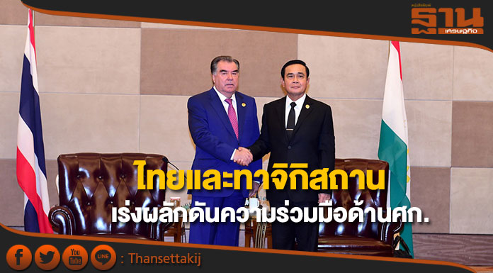 ในโอกาสนี้ ประธานาธิบดีทาจิกิสถาน แสดงความตั้งใจที่จะเร่งผลักดันความร่วมมือกับไทย โดยเฉพาะด้านที่ไทยมีความเชี่ยวชาญและประสบการณ์ เช่น ด้านการท่องเที่ยว และด้านการเกษตร ซึ่งไทยยินดีถ่ายทอดความรู้และประสบการณ์ เช่น การเกษตรอินทรีย์ และการแปรรูปอาหาร โดยยินดีต้อนรับคณะจากทาจิกิสถานไปศึกษาดูงานจากไทย ทั้งนี้ ทาจิกิสถานยังได้ให้ความสนใจต่อแนวทางการพัฒนาและการแก้ปัญหาความยากจนของไทย ซึ่งนายกรัฐมนตรีได้เสนอแนะและพร้อมแลกเปลี่ยนแนวทางการการพัฒนาอย่างยั่งยืนตามหลักปรัชญาของเศรษฐกิจพอเพียง โดยมีกลไกประชารัฐที่รัฐบาลใช้ขับเคลื่อนเพื่อสร้างความเข้มแข็งจากภายใน
