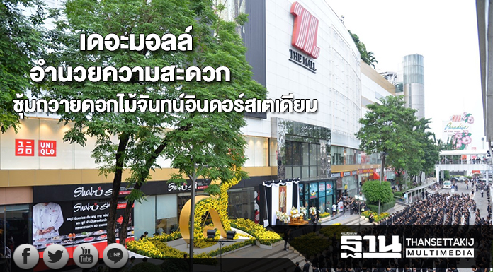 เดอะมอลล์ กรุ๊ป เตรียมจัดอาหารเจ น้ำดื่ม ให้บริการประชาชนที่มาร่วมวางดอกไม้จันทน์ ในงานพระราชพิธีถวายพระเพลิงพระบรมศพ พระบาทสมเด็จพระปรมินทรมหาภูมิพลอดุลยเดช บรมนาถพิตร ณ ซุ้มถวายดอกไม้จันทน์ บริเวณอินดอร์สเตเดียม หัวหมาก ในวันที่26 ตุลาคม นี้เพื่อร่วมอำนวยความสะดวกสำหรับประชาชน ที่มาร่วมวางดอกไม้จันทน์ ณ ซุ้มถวายดอกไม้จันทน์ บริเวณลานหน้าอินดอร์สเตเดียม หัวหมาก ซึ่งเป็น1 ใน16ซุ้มถวายดอกไม้จันทน์ขนาดใหญ่ที่ทางกรุงเทพมหานครจัดเตรียมสำหรับประชาชนในเขตพื้นที่รามคำแหง, บางกะปิ, คลองตัน, ลำสาลี, สุขาภิบาล1-3 , พัฒนาการ และบริเวณใกล้เคียง เดอะมอลล์ กรุ๊ป ได้จัดเตรียมอาหารเจ และน้ำดื่มสำหรับให้บริการประชาชนตั้งแต่เวลา 09.00-19.00 น. โดยคาดว่าในจุดนี้จะมีประชาชนมาร่วมถวายจันทน์มากกว่า5 หมื่นคน