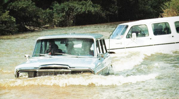 Jeep Grand Wagoneer ปี 2535 รถยนต์พระที่นั่งที่ในหลวงได้ทรงขับลุยน้ำด้วยพระองค์เอง เสด็จพระราชดำเนินไปยัง ลำพะยัง บ้านกุดตอแก่น อำเภอเขาวง จังหวัดกาฬสินธุ์ เมื่อวันที่ 25 พฤศจิกายน 2535 เพื่อทรงวางแผนสร้างอ่างเก็บน้ำ[/caption]
