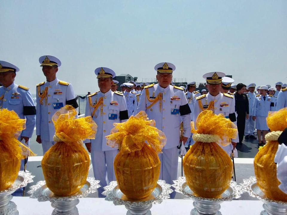 จากนั้น ขบวนรถเชิญลุ้งบรรจุเถ้าดอกไม้จันทน์ถึงอู่ทหารเรือพระจุลจอมเกล้า พลเรือโท วสันต์ บุญเนือง รองเสนาธิการทหารเรือ เดินขึ้นเรือหลวงสีชัง จุดธูปเทียนสักการะแม่ยานางเรือ บริเวณหัวเรือ เพื่อเชิญเถ้าดอกไม้จันทน์ขึ้นเรือ เจ้าหน้าที่เชิญลุ้งบรรจุเถ้าดอกไม้จันทน์ขึ้นเรือหลวงสีชัง และประดิษฐานบนโต๊ะหมู่ เรือหลวงสีชังออกเดินทางไปยังพื้นที่ประกอบพิธีลอยเถ้าดอกไม้จันทน์