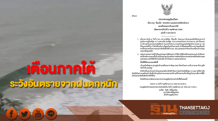 กรมอุตุนิยมวิทยา ออกประกาศกรมอุตุนิยมวิทยา"พายุ “ด็อมเร็ย” (DAMREY) และฝนตกหนักถึงหนักมาก และคลื่นลมแรงบริเวณภาคใต้ (มีผลกระทบถึงวันที่ 6 พฤศจิกายน 2560)" ฉบับที่ 4 ลงวันที่ 4 พฤศจิกายน 2560