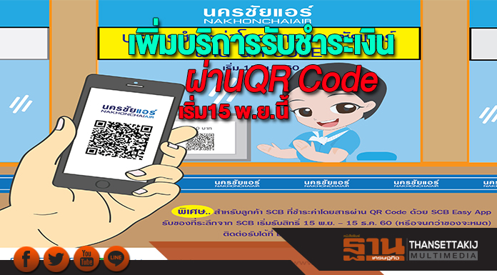 นครชัยแอร์ ยังคงมุ่งมั่นที่จะพัฒนาเทคโนโลยี และนวัตกรรมใหม่ๆมาประยุกต์ใช้ เพื่ออำนวยความสะดวกให้กับลูกค้าอยู่เสมอ ทั้งนี้ บริการชำระเงินผ่านการสแกน QR Code เป็นอีกหนึ่งทางเลือกที่น่าจะได้รับความนิยมในอนาคตอันใกล้นี้ คาดว่าจะกลายเป็นจุดเปลี่ยนของมาตรฐานการชำระเงินของประเทศไทย ซึ่งได้รับการสนับสนุนของภาครัฐฯ ที่ผลักดันให้ประเทศไทยไปสู่ Digital Economy ซึ่งประเทศไทยถือว่าเป็นประเทศที่มีความพร้อมในการใช้งานระบบการชำระเงินผ่าน QR Code และถือว่าเป็นการยกระดับการให้บริการ ลูกค้าสามารถติดตามข่าวสารเกี่ยวกับนครชัยแอร์ ได้ที่ Facebook Page นครชัยแอร์ หรือเว็บไซต์ www.nakhonchaiair.com สามารถจองตั๋วผ่านช่องทางโซเชียลมีเดีย ได้ที่ NCA Social Booking ทำรายการผ่าน Line@ พิมพ์ @nakhonchaiair หรือผ่าน Facebook พิมพ์ @nakhonchaiair.official (Messenger) และ Call Center 1624 ตั้งแต่เวลา 06:00 - 23:00 น.ทุกวัน