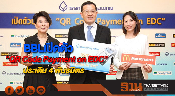 นายโชค ณ ระนอง ผู้ช่วยผู้จัดการใหญ่ สายบัตรเครดิต ธนาคารกรุงเทพ จำกัด (มหาชน) เปิดเผยว่า ธนาคารได้พัฒนาบริการ “QR Code Payment on EDC” อีกหนึ่งบริการรับชำระเงินค่าสินค้าและบริการรูปแบบใหม่ ที่ไม่ต้องใช้เงินสด โดยร้านค้าสามารถใช้เครื่องรับรูดบัตร (EDC) ปริ้นท์สลิปซึ่งมี QR Code ออกมา เพื่อให้ลูกค้าสแกนชำระเงินผ่านโมบายแบงกิ้งของทุกธนาคารในประเทศไทยได้ทันที