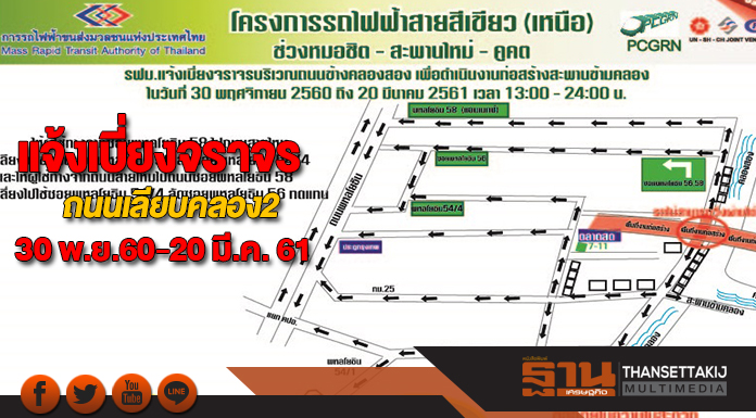 รฟม. แจ้งเบี่ยงการจราจรบนถนนเลียบคลองสอง เพื่อดำเนินงานก่อสร้างสะพานข้ามคลอง โครงการรถไฟฟ้าสายสีเขียว (เหนือ) ช่วงหมอชิต-สะพานใหม่-คูคตวันที่ 30 พ.ย.60-20 มี.ค. 61 เวลา 13.00-24.00 น.