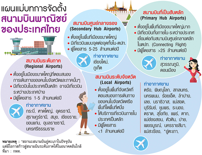 สำนักงานการบินพลเรือนแห่งประเทศไทย (กพท.) จึงได้จัดทำแผนแม่บทระบบท่าอากาศ ยานของประเทศขึ้นเป็นครั้งแรก เพื่อให้ไทยมีแนวทางในการพัฒนาสนามบินที่มีอยู่ในปัจจุบันและก่อสร้างสนามบินใหม่ได้อย่างถูกทาง เพื่อรองรับความต้องการที่เพิ่มขึ้นในอนาคต ซึ่งขณะนี้ได้จัดทำแผนแม่บทดังกล่าวแล้วเสร็จ เตรียมจะนำเสนอคณะกรรมการการบินพลเรือน (กบร.) เห็นชอบในการประชุมครั้งหน้า โดยกพท.ได้จัดทำแผนแม่บท การจัดตั้งสนามบินพาณิชย์ของประเทศ แบ่งกลุ่มท่าอากาศยานในไทยออกเป็น 4 กลุ่ม