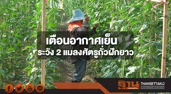 ระยะนี้จะมีอากาศเย็น มีลมแรง และมีหมอกในตอนเช้า กรมวิชาการเกษตร แนะให้เกษตรกรผู้ปลูกถั่วฝักยาวเฝ้าระวังการระบาดของเพลี้ยอ่อน และหนอนเจาะฝักลายจุด โดยจะพบการเข้าทำลายในระยะที่ต้นถั่วออกดอกและติดฝัก สำหรับเพลี้ยอ่อน มักพบตัวอ่อนและตัวเต็มวัยเพลี้ยอ่อนดูดกินน้ำเลี้ยงบริเวณยอดอ่อน ใบอ่อน ช่อดอก และฝักอ่อน ทำให้ส่วนที่ถูกทำลายบิดเบี้ยวและแกร็น หากพบการระบาด ให้พ่นด้วยสารฆ่าแมลง ฟิโพรนิล 5% เอสซี อัตรา 20 มิลลิลิตรต่อน้ำ 20 ลิตร หรือสารคาร์โบซัลแฟน 20% อีซี อัตรา 40 มิลลิลิตรต่อน้ำ 20 ลิตร หรือสารไดโนทีฟูแรน 10% ดับเบิ้ลยูพี อัตรา 20 กรัมต่อน้ำ 20 ลิตร