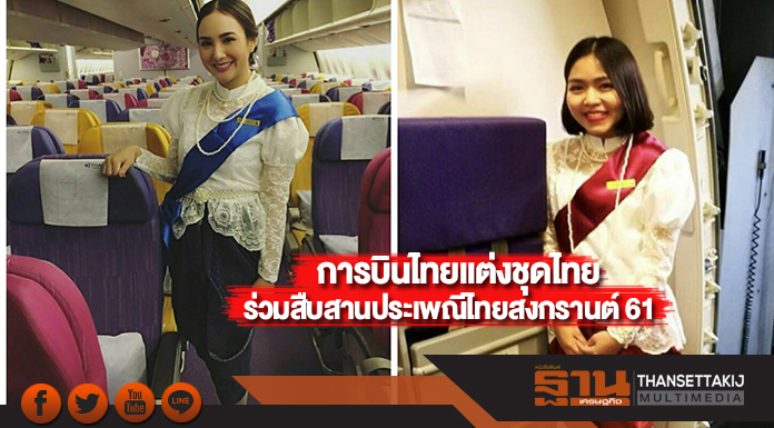 โดยเมื่อสัปดาห์ที่ผ่านมาบริษัทฯ ได้จัดงาน “ย้อนรอยวันวาน สืบสานความเป็นไทย” กระตุ้นให้พนักงานแต่งกายด้วยชุดไทยย้อนยุคหรือชุดผ้าไทยตลอดทั้งสัปดาห์ เพื่อให้มีส่วนร่วมในการใช้ผ้าไทยอย่างแพร่หลายในชีวิตประจำวัน ในส่วนของการต้อนรับเทศกาลสงกรานต์ ในปีนี้ บริษัทฯ ได้จัดให้พนักงานต้อนรับบนเครื่องบินหญิงเที่ยวบินละ 1 คน แต่งกายด้วยชุดไทยย้อนยุคสมัยรัชกาลที่ 5 (เสื้อลูกไม้และโจงกระเบน) บนเที่ยวบินของการบินไทย ตั้งแต่บัดนี้จนถึงวันที่ 30 เมษายน 2561 ทั้งในเส้นทางบินภายในประเทศและเส้นทางบินระหว่างประเทศรวมแล้วกว่าวันละ 40 เที่ยวบิน ประกอบด้วย เส้นทางบินไป-กลับ จากกรุงเทพฯ สู่เมืองต่างๆ ได้แก่ สิงคโปร์ ฮ่องกง ไทเป ฮานอย โฮจิมินห์ เวียงจันทน์ พนมเปญและย่างกุ้ง เพื่อเผยแพร่ความสวยงามของการแต่งกายชุดไทยย้อนยุคให้ชาวต่างชาติได้รู้จักและชื่นชมวัฒนธรรมไทย