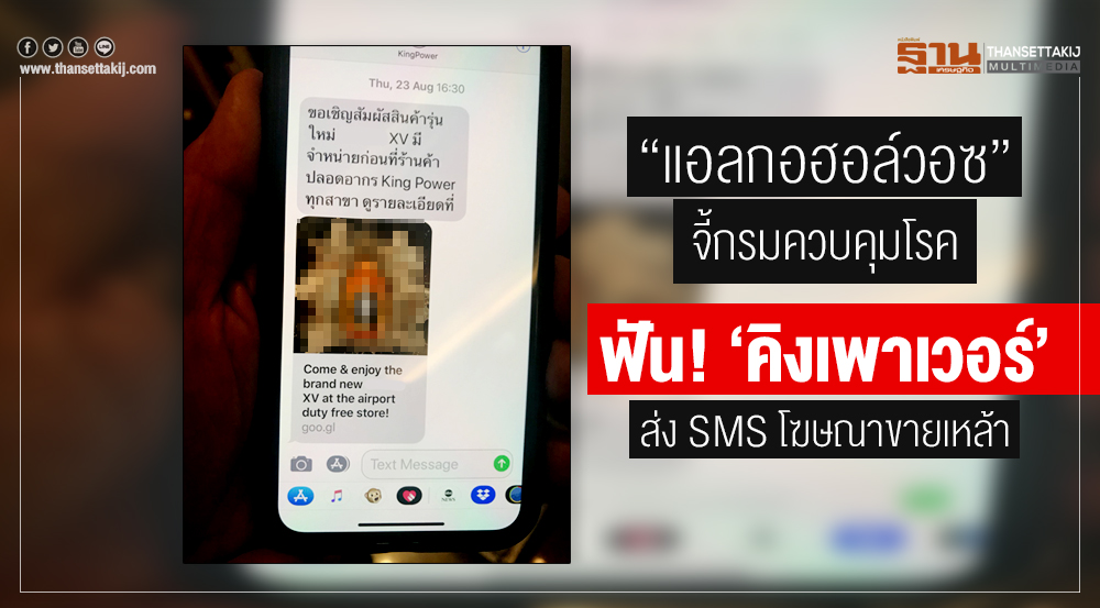 "ขอเชิญสัมผัสสินค้ารุ่นใหม่จาก ... (ระบุชื่อยี่ห้อสุรายี่ห้อหนึ่ง) มีจำหน่ายก่อนที่ร้านปลอดอากร King power ทุกสาขา ดูรายละเอียดที่ ..." พร้อมกับแนบลิงก์ที่มีข้อความและรูปภาพของขวดสุรายี่ห้อดังกล่าวชัดเจน