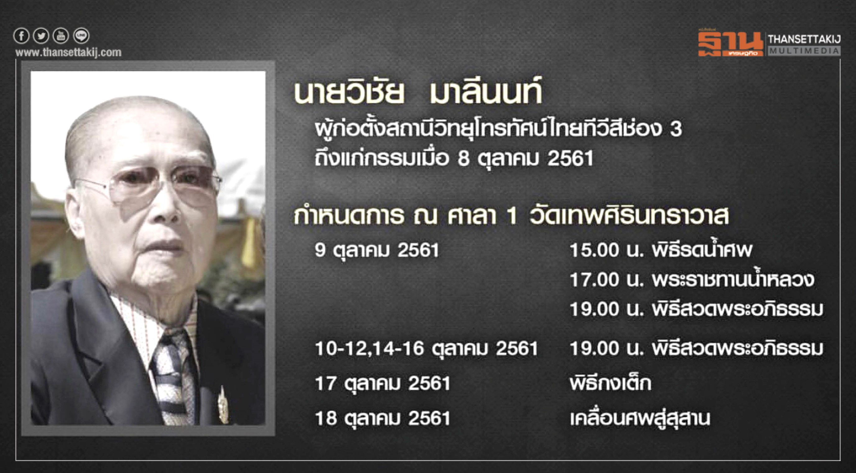 เมื่อวันที่ 8 ตุลาคม 2561 กลุ่มธุรกิจ บีอีซี เวิลด์ จำกัด (มหาชน) หรือ BEC ได้สูญเสียผู้ก่อตั้งและสร้างธุรกิจ "วิชัย มาลีนนท์" สถานีโทรทัศน์ไทยทีวีสีช่อง 3 (33) ด้วยวัย 99 ปี