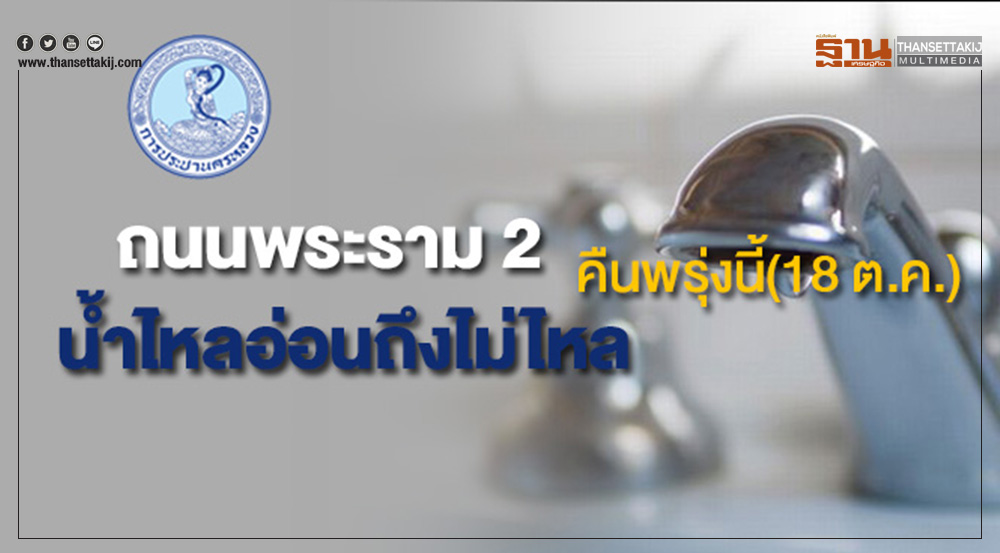 รางานข่าวจากการประปานครหลวง(กปน.)เผยว่า การประปานครหลวง มีความจำเป็นต้องซ่อมท่อประธานขนาดเส้นผ่านศูนย์กลาง 1,000 มิลลิเมตร ที่แตกรั่ว บริเวณคลองรางแก้ว ถนนพระรามที่ 2 เพื่อให้ประชาชนได้รับบริการน้ำประปาอย่างเพียงพอและทั่วถึง ซึ่งจะดำเนินการ ในคืนวันพฤหัสบดีที่ 18 ตุลาคม 2561 ตั้งแต่เวลา 22.00 - 05.00 น. ของวันรุ่งขึ้น โดยระหว่างดำเนินการ ส่งผลให้ น้ำประปาไหลอ่อนถึงไม่ไหล ในพื้นที่ดังต่อไปนี้