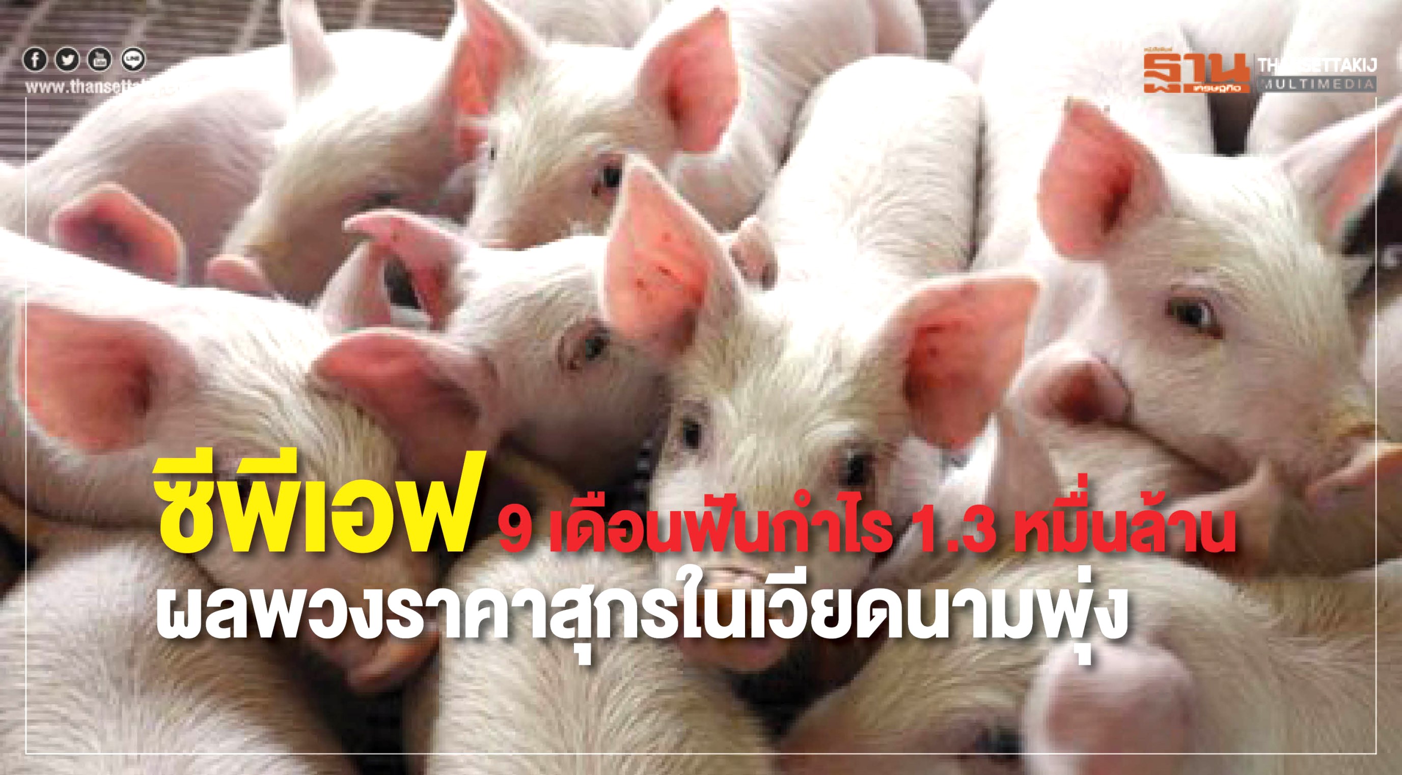 ซีพีเอฟแจ้งยอดขายรอบ 9 เดือน 3.9 แสนล้าน กำไรสุทธิ 1.3 หมื่นล้าน ชี้ผลพวงราคาสุกรในเวียดนามฟื้นกลับจากภาวะล้นตลาด ขณะแนวโน้มเติบโตต่อเนื่องจากกิจการในต่างประเทศ เล็งเป้ายอดขายอีก 5 ปี แตะ 6 แสนล้าน
