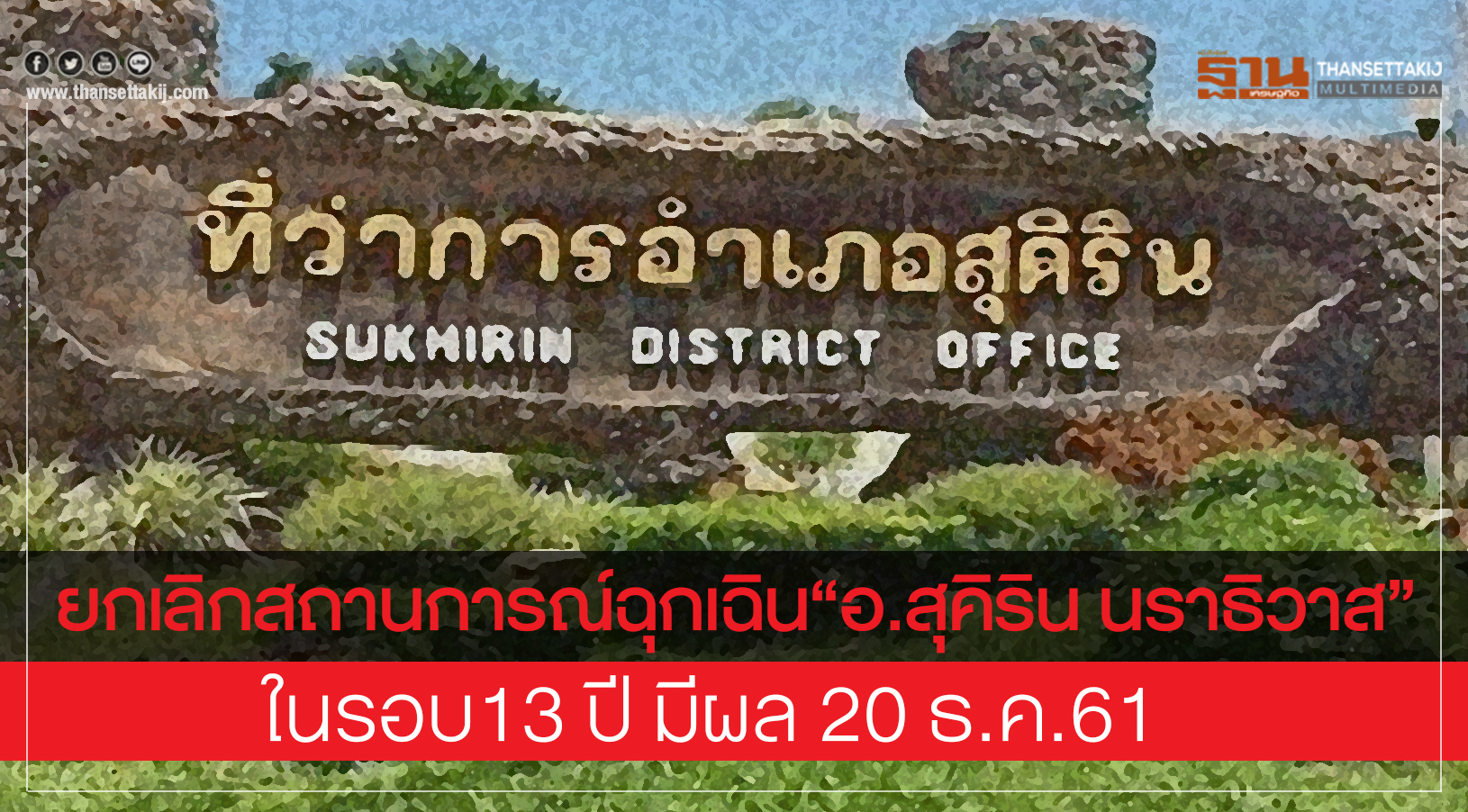 โดยที่ปรากฏว่าในปัจจุบันสถานการณ์อันเป็นเหตุให้มีการประกาศสถานการณ์ฉุกเฉินที่มีความร้ายแรงในเขตท้องที่อำเภอสุคิริน จังหวัดนราธิวาส อยู่ในภาวะที่เจ้าหน้าที่ของรัฐและหน่วยงานของรัฐสามารถใช้มาตรการต่างๆ เข้าควบคุม ระงับยับยั้ง และแก้ไขปัญหาได้ตามปกติแล้ว ดังนั้น อาศัยอำนาจตามความในมาตรา 5 วรรคสาม ประกอบกับมาตรา 11 วรรคสาม แห่งพระราชกำหนดการบริหารราชการในสถานการณ์ฉุกเฉิน พ.ศ. 2548 นายกรัฐมนตรีจึงออกประกาศไว้ ดังต่อไปนี้ “ให้ยกเลิกการประกาศสถานการณ์ฉุกเฉินที่มีความร้ายแรงในเขตท้องที่อำเภอสุคิริน จังหวัดนราธิวาส ทั้งนี้ ตั้งแต่วันที่ 20 ธันวาคม พ.ศ. 2561 เป็นต้นไป ประกาศ ณ วันที่ 4 ธันวาคม พ.ศ. 2561”