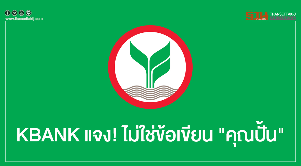 ธนาคารขอเรียนให้ทราบว่า ข้อความดังกล่าวประธานเจ้าหน้าที่บริหารของธนาคารไม่ได้เขียน หรือมีส่วนเกี่ยวข้องกับข้อความดังกล่าวแต่อย่างใด ทั้งนี้ หากมีข้อสงสัยเกี่ยวกับข้อมูลหรือข่าวสารของธนาคาร ท่านสามารถสอบถามผ่าน K-Contact Center 02-8888888 ตลอด 24 ชม.