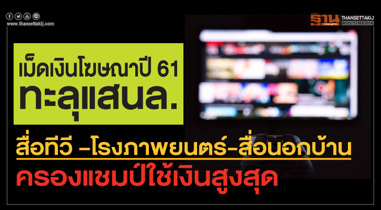 ล่าสุด บริษัท นีลเส็น (ประเทศไทย) จำกัด รายงานการใช้เม็ดเงินโฆษณาผ่านสื่อในช่วง 12 เดือนที่ผ่านมา (ม.ค. - ธ.ค. 61) ว่า มีมูลค่ารวม 105,455 ล้านบาท เติบโต 3.9% ประกอบด้วย ทีวี 67,935 ล้านบาท โต 8.05%, เคเบิ้ล-ทีวีดาวเทียม 2,434 ล้านบาท ติดลบ 16.44%, วิทยุ 4,802 ล้านบาท โต 7.28%, หนังสือพิมพ์ 6,100 ล้านบาท ติดลบ 20.84%, นิตยสาร 1,315 ล้านบาท ติดลบ 33.65%, สื่อในโรงภาพยนตร์ 7,312 ล้านบาท โต 7.28%, ป้ายกลางแจ้ง 6,833 ล้านบาท โต 7.03%, สื่อเคลื่อนที่ 6,067 ล้านบาท โต 3.25%, สื่อ ณ จุดขาย 1,054 ล้านบาท โต 11.42%, อินเตอร์เน็ต 1,605 ล้านบาท โต 6.08%