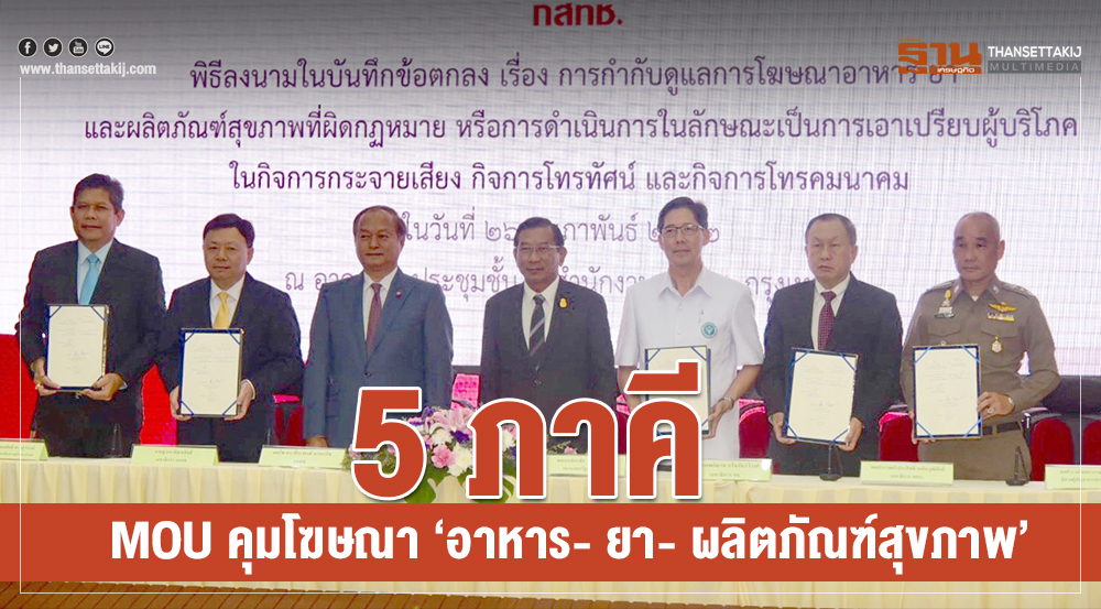 อย. ร่วมกับ กสทช. – สคบ. - ดีอี - สตช. ลงนามการกำกับดูแลการโฆษณาอาหาร ยา และผลิตภัณฑ์สุขภาพที่ผิดกฎหมาย ทั้งทางสื่อวิทยุกระจายเสียง โทรทัศน์ อินเทอร์เน็ต และสื่อสังคมออนไลน์ หวังลดปัญหาการโฆษณาอาหาร ยา เกินจริง หลอกลวงผู้บริโภค