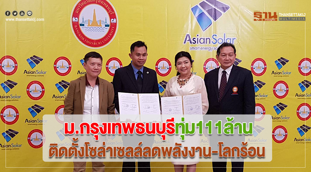 19 มี.ค.62 -ห้องรับรอง อาคารสปอร์ตคอมเพล็กซ์ มหาวิทยาลัยกรุงเทพธนบุรี ได้มีพิธีลงนาม สัญญาการจัดการพลังงาน ด้วยระบบผลิตไฟฟ้าเซลล์แสงอาทิตย์ ระหว่างผู้บริหารมหาวิทยาลัยกรุงเทพธนบุรีกับบริษัท เอเซียนโซลาร์ จำกัด โดย ผศ.ดร.บังอร เบ็ญจาธิกุล อธิการบดีมหาวิทยาลัยกรุงเทพธนบุรี เผยว่า มหาวิทยาลัยกรุงเทพธนบุรีมีความมุ่งมั่นตั้งใจ และผลิตบัณฑิตออกสู่สังคม เพื่อเป็นบุคคลากรของประเทศที่มีคุณภาพและมีความรู้ความสามารถเป็นที่ยอมรับในการสร้างสรรค์สังคม มหาวิทยาลัยจึงเน้นเรื่องการปลูกฝังค่านิยมการเป็นส่วนหนึ่งของสังคมไทยและสังคมโลกแก่นักศึกษาและบัณฑิต ในปัจจุบันคงปฏิเสธไม่ได้ว่าภาวะโลกร้อนที่เกิดขึ้นขณะนี้เป็นปัญหาระดับโลก และเป็นเรื่องที่ประเทศต่างๆ ทั่วโลกตระหนักและให้ความสำคัญในการร่วมกันแก้ไขปัญหา
