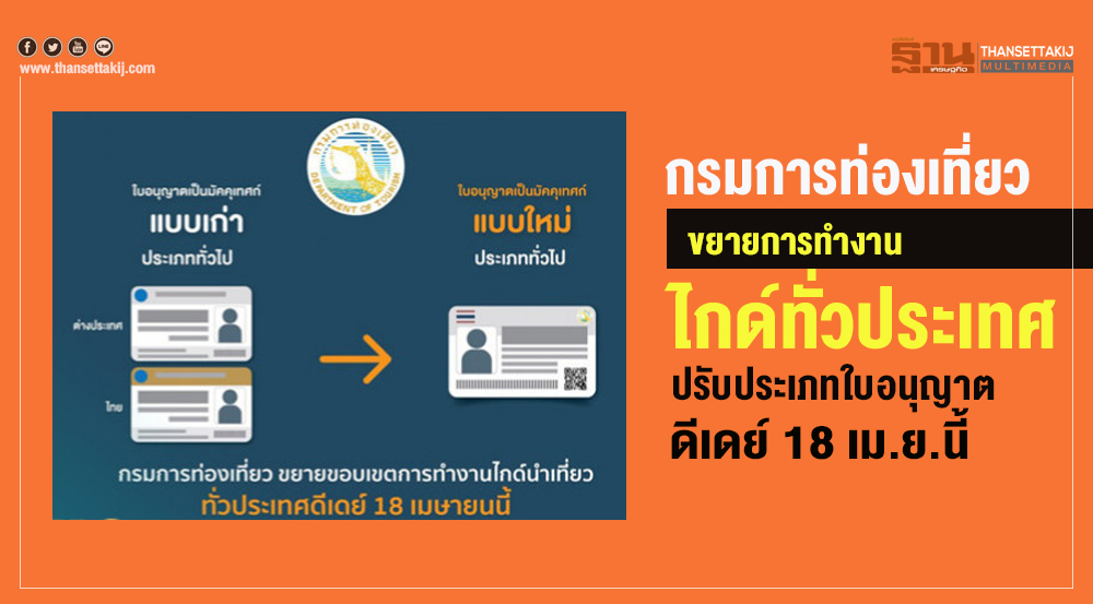 กรมการท่องเที่ยว กระทรวงการท่องเที่ยวและกีฬา ขยายขอบเขตการทำงานมัคคุเทศก์ทั่วประเทศ ปรับประเภทใบอนุญาตเป็นมัคคุเทศก์ใหม่ เป็น 3 ประเภท 6 ชนิด เริ่มใช้งาน 18 เม.ย. นี้
