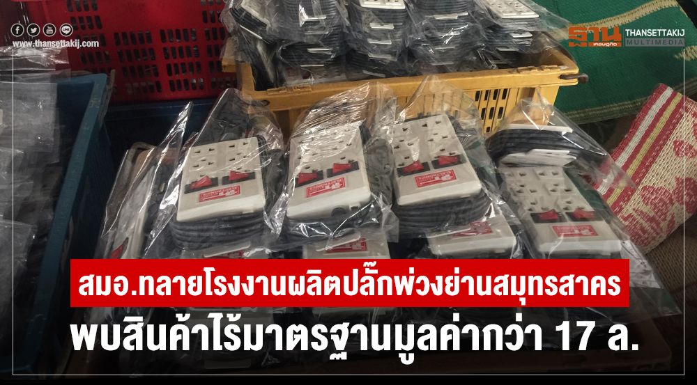 สมอ. บุกโรงงานผลิตปลั๊กพ่วงย่านสมุทรสาคร พบสินค้าไม่ได้มาตรฐานยี่ห้อ CKL , ST , CAT , เอส.ไอ.เอส , J.J. ELECTRONICS , PT ELECTRONICS รอจำหน่ายกว่า 12,000 ชิ้น และชิ้นส่วนอุปกรณ์รอประกอบกว่า 100,000 ชิ้น รวมมูลค่ากว่า 17 ล้านบาท