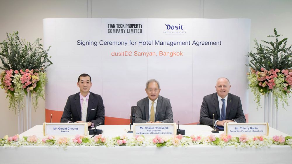 ดุสิต อินเตอร์เนชั่นแนล ลงนามกับบริษัท เทียน เต็ก พร็อพเพอร์ตี้ เพื่อเข้าบริหารดุสิตดีทู สามย่าน กรุงเทพ ตั้งอยู่หัวมุมถนนสี่พระยาตัดกับถนนนเรศ