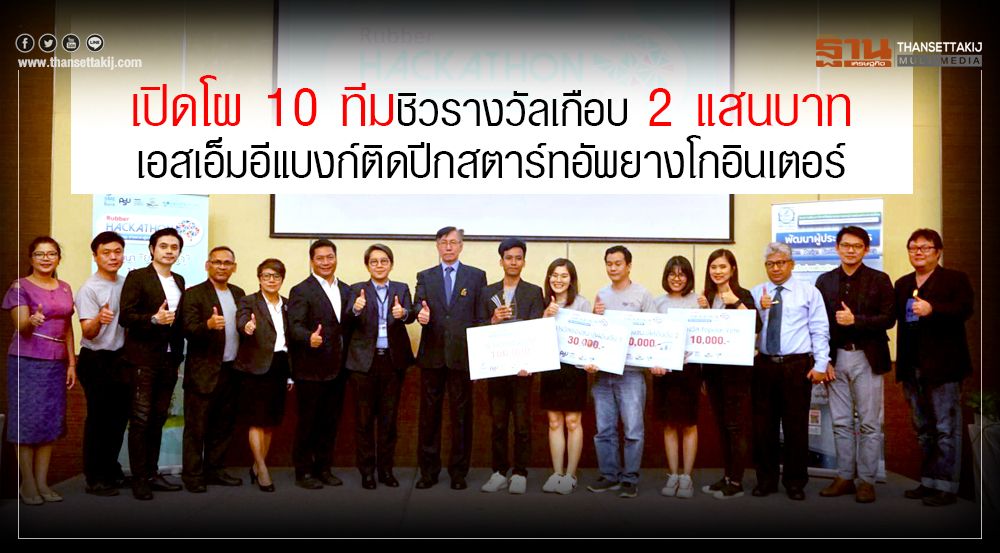 SME D Bank ร่วมกับ สถาบันวิจัยและพัฒนานวัตกรรมยางพารา มหาวิทยาลัยสงขลานครินทร์ แจงบทสรุปความสำเร็จโครงการ “SME D Scaleup Rubber HACKATHON 2019 ติดปีก Startup ยางพาราสู่สากล” ดีเดย์ 16 ส.ค. เปิดผลแข่งขันนำเสนอจาก 10 ทีมสุดท้าย รับรางวัลเกือบ 2 แสนบาท