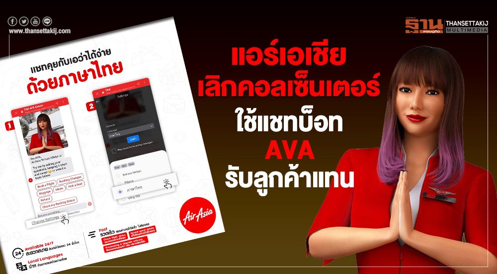 แอร์เอเชียและแอร์เอเชีย เอ็กซ์ พร้อมก้าวสู่การเป็นสายการบินดิจิตอลเต็มตัว ปรับเเผนการให้บริการ โดยตั้งแต่วันที่ 1 พฤศจิกายน 2562 ศูนย์บริการ AirAsia call centre จะย้ายมาให้บริการทั้งหมด ผ่านช่องทางดิจิตอล AVA Live Chat ทั้งทาง www.AirAsia.com คลิกเลือก “บริการความช่วยเหลือ” หรือผ่าน AirAsia mobile App พร้อมให้บริการตลอด 24 ชั่วโมง
