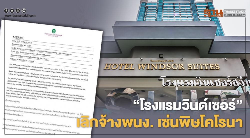 โรงแรมวินด์เซอร์ สวีทส์ กรุงเทพ (Windsor Suites Bangkok) ออกหนังสือประกาศเลิกจ้างพนักงานและปิดกิจการซึ่งจะมีผลตั้งแต่วันที่ 30 เมษายน 2563 เป็นต้นไป ทั้งนี้เนื่องจากประสบปัญหาทางเศรษฐกิจ รวมไปถึงผลจากการระบาดของเชื้อไวรัสโควิด19 ด้วย