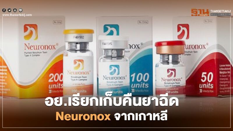 อย. เรียกคืนยาฉีด Neuronox จากเกาหลี หลังพบปลอมแปลงข้อมูลผลวิเคราะห์ และใช้สารตั้งต้นที่ไม่ได้รับการรับรองมาตรฐาน ขอให้โรงพยาบาลและคลินิกทุกแห่งระงับการใช้พร้อมส่งคืนผู้ขาย