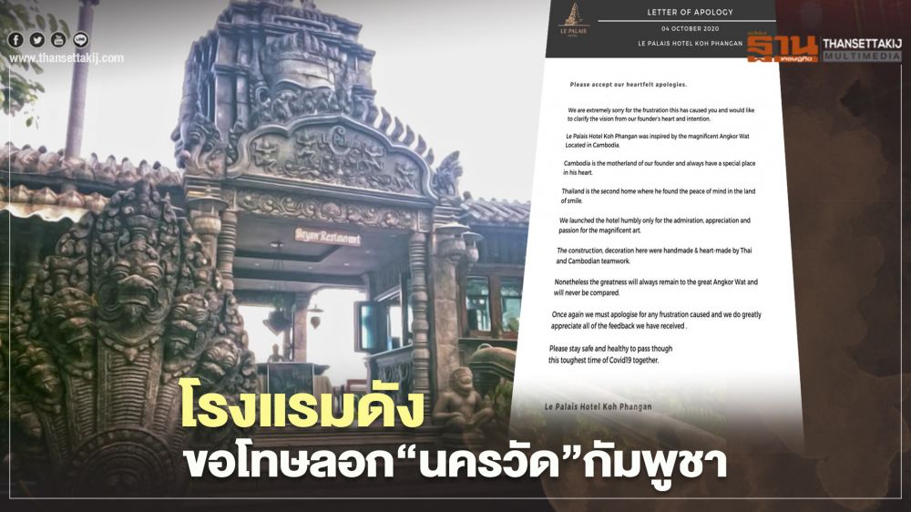 กรณีเกิดการวิพากษ์วิจารณ์ในสื่อสังคมออนไลน์ในกัมพูชา ถึงโรงแรม Le Palais เกาะพงัน จ.สุราษฎร์ธานี ที่ใช้ศิลปะของ “อังกอร์วัด” หรือ"นครวัด" ตกแต่งสถานที่และการใช้ชื่อประเภทห้องพักพร้อมคำบรรยายอย่างไม่เหมาะสม โดยชาวกัมพูชาต่างแสดงความคิดเห็นต่าง ๆ ด้วยความโกรธในความรู้สึกว่าวัฒนธรรมกัมพูชาถูกคนต่างชาติขโมยมาใช้ประโยชน์ทางธุรกิจ เช่น นครวัดเป็นสมบัติของคนกัมพูชา จึงเป็นสิ่งไม่ถูกต้องที่ต่างชาติจะขโมยวัฒนธรรม