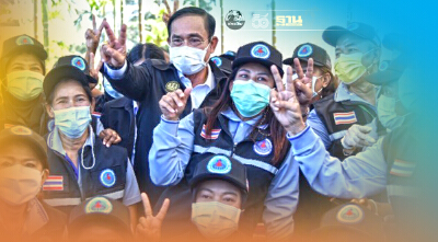 จากนั้น นายกฯ ได้เดินทักทายและให้กำลังใจกลุ่มเจ้าหน้าที่ และ อสม.ที่มารอต้อนรับ โดย อสม.ได้ร้องเพลงและตะโกนให้กำลังใจว่า "นายกฯ สู้ๆ"