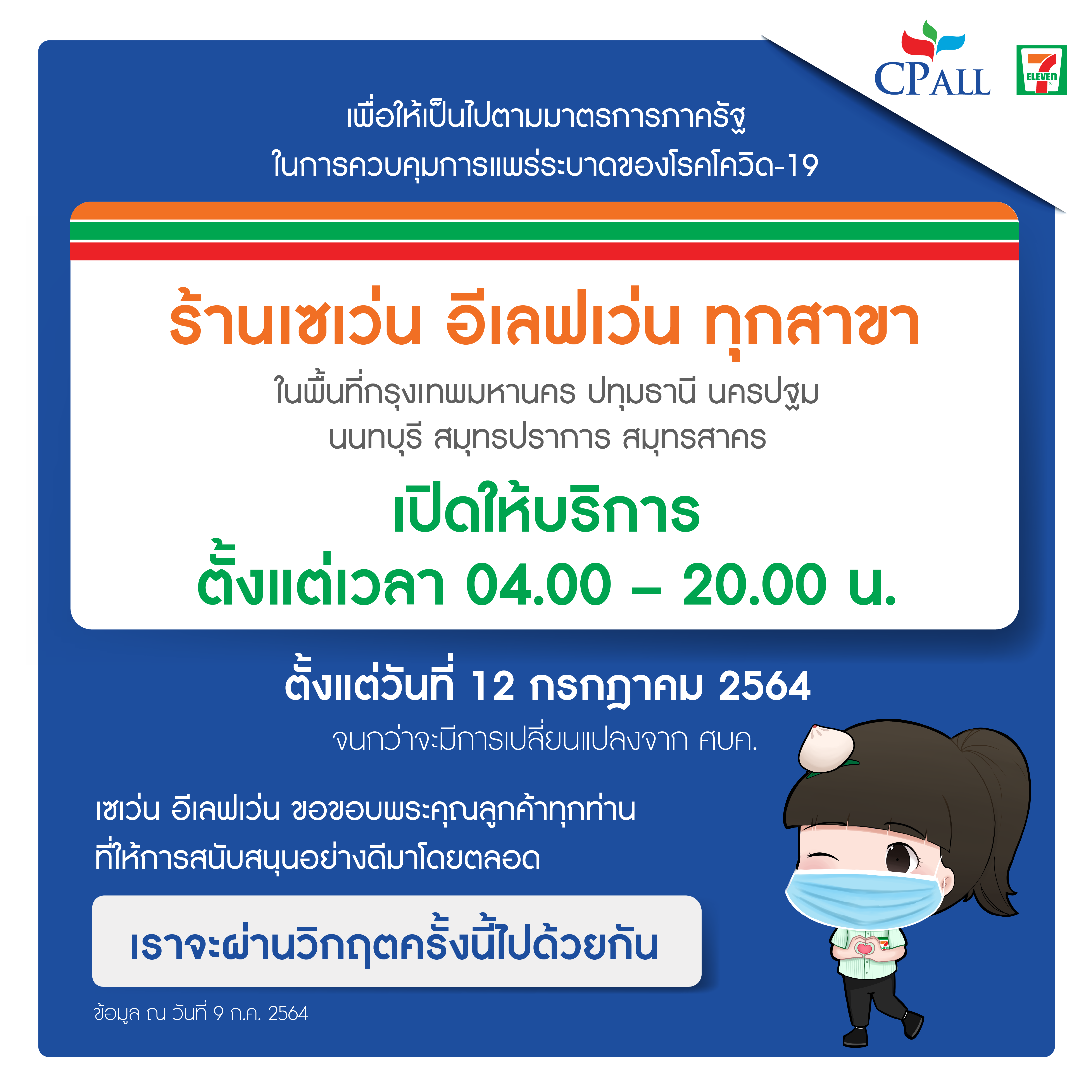 บริษัท ซีพี ออลล์ จำกัด (มหาชน) ผู้บริหารเซเว่น อีเลฟเว่น และเซเว่น เดลิเวอรี่ ได้ให้ความร่วมมือปฏิบัติตามมาตรการดังกล่าวอย่างเคร่งครัด โดยในวันนี้ ร้านเซเว่น อีเลฟเว่นทุกสาขาในพื้นที่กรุงเทพมหานคร นนทบุรี ปทุมธานี นครปฐม สมุทรปราการ และสมุทรสาคร ได้เริ่มเปิดให้บริการเวลา 04.00 น.