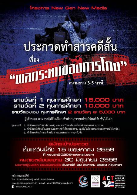 โครงการ New Gen New Media องค์กรต่อต้านคอร์รัปชัน (ประเทศไทย) จัดประกวดผลิตคลิปวีดีโอสั้น และอินโฟกราฟิก หัวข้อ “ผลกระทบของการโกง” สำหรับนักศึกษา ขอเชิญชวนนักศึกษา มหาวิทยาลัยราชภัฏ และ มหาวิทยาลัยราชมงคลทุกแห่งทั่วประเทศ ที่เรียนคณะนิเทศศาสตร์ และสาขาวิชาที่เกี่ยวข้อง ที่พร้อมจะกลายเป็น“นักสื่อสารมวลชนในอนาคต” ที่ดี และมีอุดมการณ์เพื่อประเทศไทย เข้าร่วมประกวดผลิตคลิปวีดีโอสารคดีสั้น และ Infographic ในหัวข้อ "ผลกระทบของการโกง” ลงชื่อสมัครเข้าประกวดตั้งแต่วันนี้ถึง 15 พฤษภาคม 2559 หมดเขตส่งผลงาน 30 มิถุนายน 2559 ดูรายละเอียดเพิ่มเติมที่ http://www.anticorruption.in.th/ และ www.facebook.com/Youth2020.Act