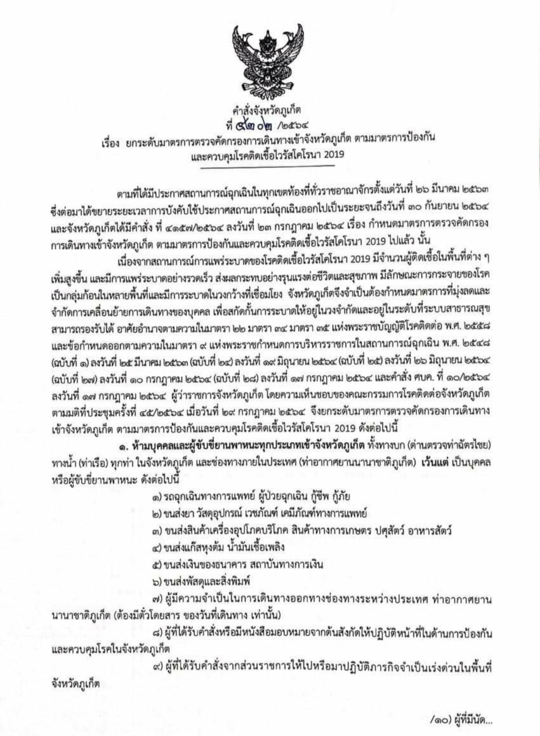 นายณรงค์ วุ่นซิ้ว ผู้ว่าราชการจังหวัดภูเก็ต ออกประกาศยกระดับมาตรการตรวจคัดกรองการเดินทางเข้าจังหวัดภูเก็ต โดยมีสาระสำคัญ ดังนี้