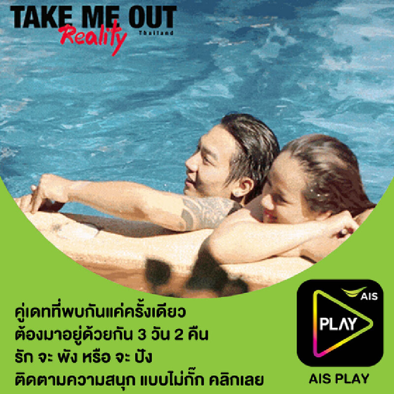 เอไอเอส ชวนแฟนรายการ Take Me Out Thailand ตามติดชีวิตจริงหลังลงจากเวทีของคู่เดทกับคอนเทนต์สุดเอ็กซ์คลูซีฟ Take Me Out Reality บนแอป AIS Play ที่แรกก่อนใคร ชมฟรี! (ไม่คิดค่าคอนเทนต์ คิดเฉพาะค่าดาต้าตามแพ็กเกจที่ลูกค้าเลือก) ตั้งแต่วันนี้ – ต.ค. 59 แล้วมาร่วมลุ้นว่ารักแรกพบจะจบ หรือจิ้นกันต่อ เมื่อคู่รักป้ายแดงต้องใช้ชีวิตอยู่ร่วมกัน 3 วัน 2 คืน ในบรรยากาศสุดโรแมนติก