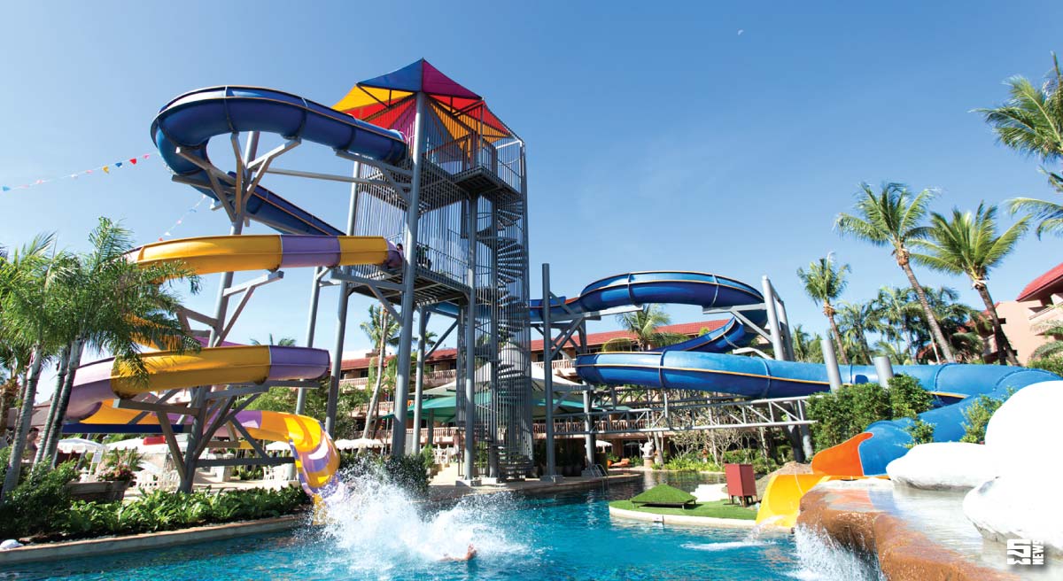 มาพักที่นี่ก็แทบจะเหมือนมาเที่ยวสวนน้ำขนาดย่อมๆ เพราะไม่ใช่แค่สไลเดอร์ที่หลากหลายไซด์เท่านั้น แต่ที่นี่ยังมีสระว่ายน้ำขนาดใหญ่สไตล์ลากูนถึง 3 สระ รวมถึงสระว่ายน้ำสำหรับเด็ก และจากุชชี่ ที่กระจายอยู่รอบๆ ทำให้มีการแบ่งโซนการลงเล่นน้ำได้สบายๆไม่อึดอัด ขณะที่คิดส์คลับที่นี่ ก็เก๋หยอกใคร จากรูปลักษณ์ที่เหมือนอยู่ในถ้ำ ชวนให้น่าค้นหา ขณะเดียวกันยังมีสนามเด็กเล่นในแบบเอ้าท์ดอว์ และสนามเตะฟุตบอลเล็กๆ ให้เด็กๆของคุณได้ออกเหงื่อและปีนป่ายกันอย่างสนุกสนาน
