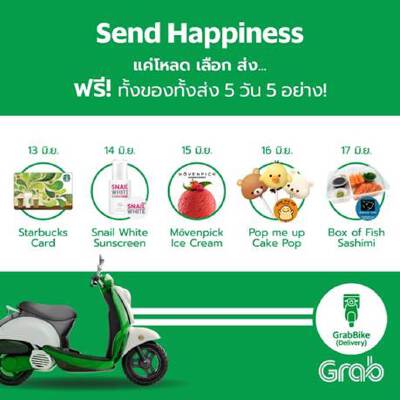 รายงานข่าวจากแกร็บ (Grab) แพลทฟอร์มด้านบริการขนส่งชั้นนำในภูมิภาคเอเชียตะวันออกเฉียงใต้ เผยได้ ได้จัดโปรโมชั่นแคมเปญ “Send Happiness" ชวนคุณส่งความสุขถึงคนที่คุณรัก แกร็บไบค์ เดลิเวอรี่ (GrabBike Delivery) มอบของขวัญสุดเซอร์ไพรส์ 5 วัน กว่า 2,500 รางวัล ได้แก่ บัตรแทนเงินสดกาแฟสตาร์บัคส์, ครีมกันแดด Snail White, ไอศกรีมช็อกโกแลต Mövenpick, Cake Pop จากร้าน Pop Me Up และซาชิมิสุดอร่อยจากร้าน Box Of Fish โดยมอบให้ฟรีทั้งค่าของขวัญและค่าบริการส่ง!!!! โดยลูกค้าแกร็บไบค์ เดลิเวอรี่ สามารถลุ้นรับสิทธิ์ง่ายๆ เพียงเปิดแอพพลิเคชั่น Grab กดเลือกประเภทรถเป็น “Send Happiness” และเลือกจุดหมายปลายทางที่อยู่ของคนพิเศษที่คุณต้องการให้ไปส่งของ หลังจากนั้นใส่รหัสโปรโมชั่นคำว่า “HAPPY” เพื่อกดเรียกรถและลุ้นรับรางวัลพิเศษประจำวัน (จำนวนจำกัดวันละ 500 รางวัล และ1 สิทธิ์ ต่อ 1 รางวัล) โดยไม่ต้องเสียค่าใช้จ่ายใดๆ ทั้งสิ้น ตั้งแต่เวลา 10.00 น. ของทุกวัน ตั้งแต่วันนี้ - 17 มิ.ย. 2559 หรือจนกว่าสินค้าจะหมด