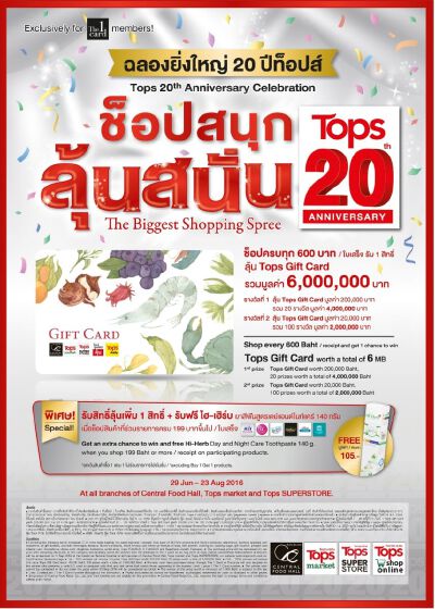 ท็อปส์ ฉลองยิ่งใหญ่ครบรอบ 20 ปี มอบของขวัญพิเศษแทนคำขอบคุณลูกค้า ด้วยแคมเปญ “ช็อปสนุก ลุ้นสนั่น สมาชิกเดอะวันการ์ด ลุ้นรับ Tops Gift Card รวมมูลค่า 6,000,000 บาท” ช็อปครบทุก 600 บาท/ใบเสร็จ รับ 1 สิทธิ์ ลุ้น