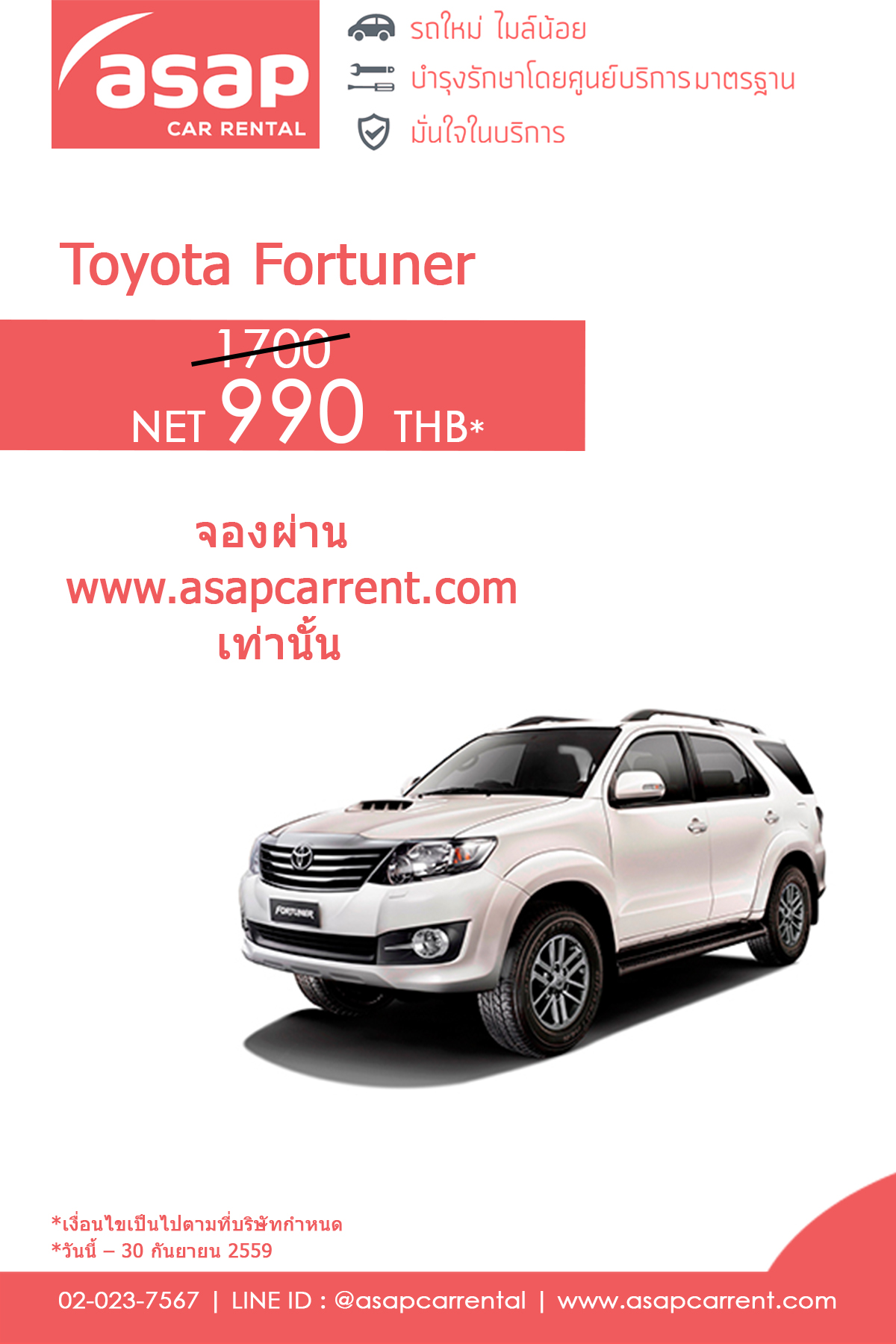บริษัท ซินเนอร์เจติค ออโต้ เพอร์ฟอร์มานซ์ จำกัด ผู้ให้บริการรถเช่าระยะสั้น เอแซ็ป (ASAP) รถใหม่ ไมล์น้อย จัดโปรโมชั่นสุดพิเศษเพื่อเป็นของขวัญสำหรับวันแม่ในปีนี้ ด้วยโปรโมชั่นหรรษาพาแม่เที่ยว เพียงเช่ารถ Toyota Fortuner จากราคาเต็ม 1,700 บาท เหลือเพียง 990 บาท ด้วยการจองผ่านเว็บไซด์ www.asapcarrent.com เท่านั้น คุณก็จะได้ยกขบวนไปเที่ยวหรรษากันได้ทั้งครอบครัว โปรโมชั่นนี้ตั้งแต่วันนี้ ถึง 30 กันยายน 2559 เท่านั้น