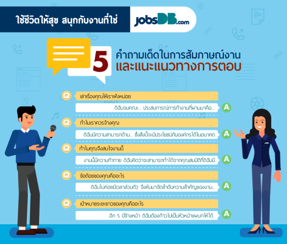 สำหรับคนหางาน หลังจากที่คุณยื่นใบสมัครงานกับองค์กรที่คุณฝันอยากจะร่วมงานด้วยเป็นที่เรียบร้อยแล้ว แน่นอนว่าเราทุกคนต่างตั้งหน้าตั้งตารอการเรียกสัมภาษณ์ซึ่งเป็นเหมือนประตูด่านแรก ที่เปิดโอกาสให้คุณได้เข้าไปเห็นสถานที่ทำงานจริง และพูดคุยกับหัวหน้างานของคุณในอนาคต ข้อมูลจาก jobsDB ระบุว่า 70% ของคนที่ไม่ได้รับคัดเลือกเข้าทำงาน มีสาเหตุมาจากการสอบสัมภาษณ์งานไม่ผ่าน หรือตอบคำถาม และพรีเซนต์ตัวเองได้ไม่โดนใจฝ่าย HR ดังนั้น jobsDB จึงอยากให้คุณใช้เวลาว่างระหว่างรอเรียกสัมภาษณ์งาน เพื่อเตรียมตัวรับมือกับคำถามยอดฮิตที่มีผลต่อการตัดสินใจรับเข้าทำงานทั้ง 5 ข้อนี้ให้ดี เพราะมันจะช่วยให้คุณก้าวเข้าไปเป็นพนักงานใหม่ในองค์กรในฝันได้อย่างสวยงาม