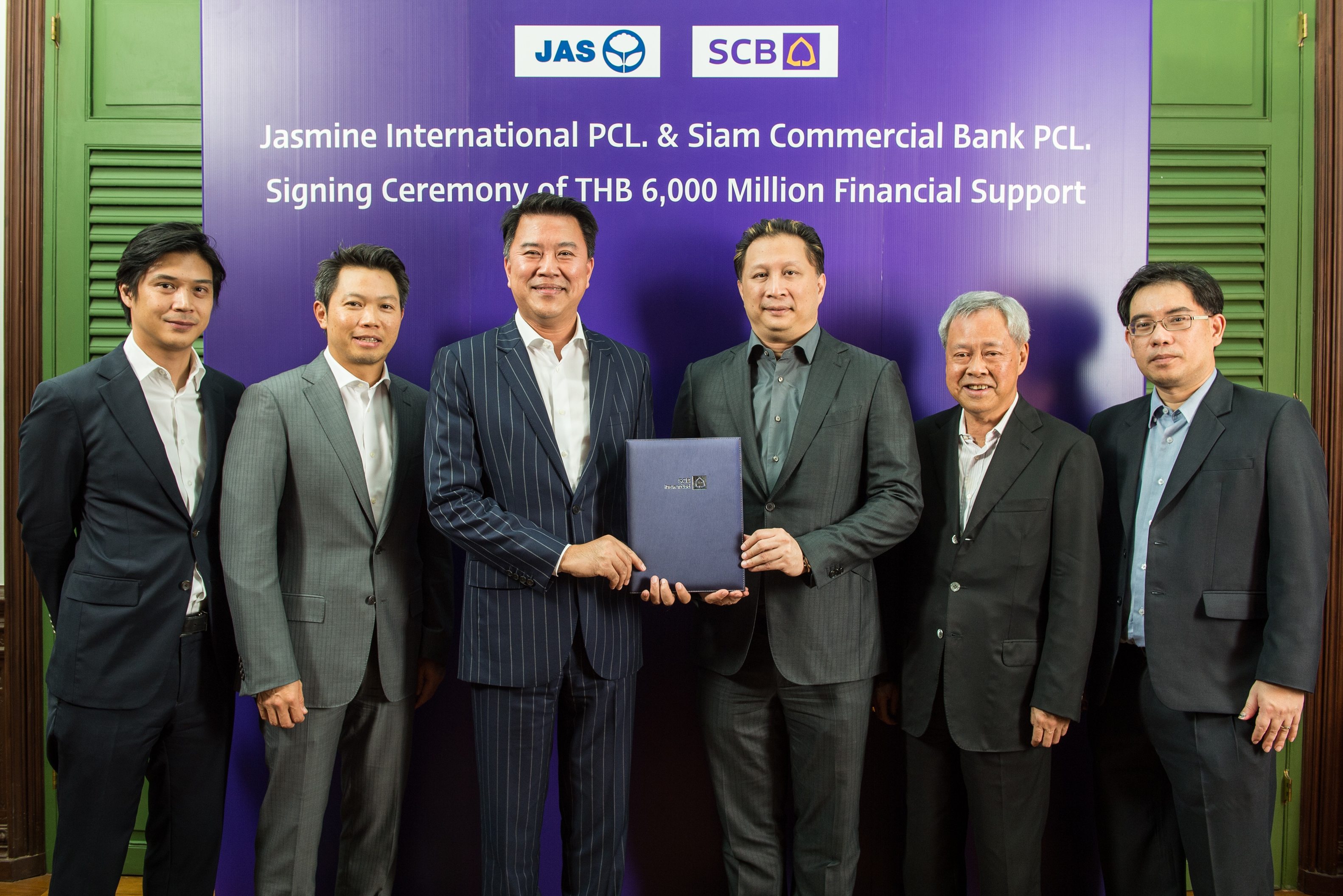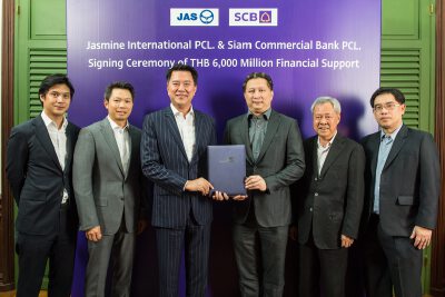 นายอาทิตย์ นันทวิทยา กรรมการผู้จัดการใหญ่ และประธานเจ้าหน้าที่บริหาร ธนาคารไทยพาณิชย์ พร้อมด้วย นายพิชญ์ โพธารามิก ประธานเจ้าหน้าที่บริหารและกรรมการ บริษัท จัสมิน อินเตอร์เนชั่นแนล จำกัด (มหาชน) ร่วมลงนามในสัญญาสนับสนุ นทางการเงินมูลค่า 6,000 ล้านบาท ให้กับกลุ่มบริษัท จัสมิน อินเตอร์เนชั่นแนล ผู้ให้บริการด้านเทคโนโลยีสื่อสารครบวงจร ทั้งในประเทศและระหว่างประเทศ เพื่อพัฒนาโครงข่ายบรอดแบนด์อิน เทอร์เน็ตตามแผนการขยายการลงทุนเพื่อให้ครอบคลุมพื้นที่ให้บริ การทั่วประเทศ รวมถึงรองรับการขยายตัวของธุรกิ จในอนาคตอีกด้วย งานจัดขึ้นเมื่อเร็ว ๆ นี้ ณ โรงแรม W Hotel