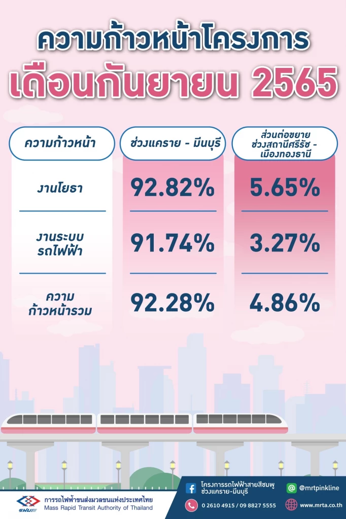 ขณะที่โครงการรถไฟฟ้าสายสีชมพู ช่วงแคราย - มีนบุรี ระยะทาง 34.5 กิโลเมตร ความก้าวหน้างานโยธา 92.82% ความก้าวหน้างานระบบรถไฟฟ้า 91.74% ความก้าวหน้าโดยรวม 92.28% โดยจะมีการทดสอบระบบการเดินรถประมาณ 5 เดือน คาดว่าจะเริ่มทยอยเปิดให้บริการเป็นบางช่วงได้อย่างช้าไม่เกินไตรมาส 1 ปี 2566