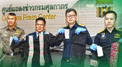 พล.ต.ต.พรพิทักษ์ รู้ยืนยง รองผู้บัญชาการตำรวจปราบปรามยาเสพติด นายพันธ์ทอง ลอยกุลนันท์ รองอธิบดีกรมศุลกากร รักษาการในตำแหน่งที่ปรึกษาด้านการพัฒนาและบริหารการจัดเก็บภาษี นายพงศ์เทพ บัวทรัพย์ รองอธิบดี รักษาการในตำแหน่งที่ปรึกษาด้านพัฒนาระบบควบคุมทางศุลกากร นายจักกฤช อุเทนสุต ผู้อำนวยการสำนักงานศุลกากรตรวจสินค้าท่าอากาศยานสุวรรณภูมิ ณ ศูนย์แถลงข่าว ชั้น 2 อาคาร 1 กรมศุลกากร คลองเตย
