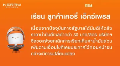 เคอรี่ เอ็กซ์เพรส แจ้งยกเลิกการเรียกเก็บค่าน้ำมันส่วนเพิ่ม หลังรัฐบาลได้มีมติเห็นชอบให้ตรึงราคาน้ำมันดีเซลต่ำกว่า 30 บาท/ ลิตร