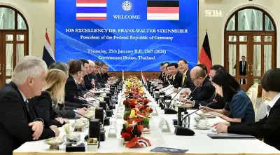 วันนี้ (25 มกราคม 2567) ที่ทำเนียบรัฐบาล นายเศรษฐา ทวีสิน นายกรัฐมนตรีและรัฐมนตรีว่าการกระทรวงการคลัง หารือเต็มคณะ ร่วมกับ นายฟรังค์-วัลเทอร์ ชไตน์ไมเออร์ (H.E. Dr. Frank-Walter Steinmeier) ประธานาธิบดีแห่งสหพันธ์สาธารณรัฐเยอรมนี นาย Michael Kellner รัฐมนตรีช่วยว่าการกระทรวงเศรษฐกิจและการปฏิบัติการด้านสภาพภูมิอากาศ สหพันธ์สาธารณรัฐเยอรมนี (BMWK)