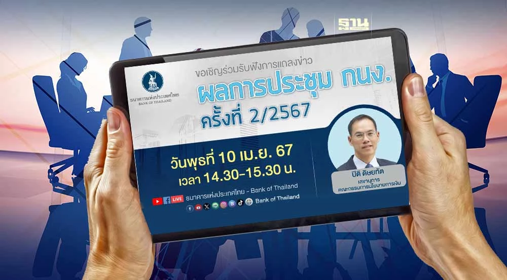 โดยแฟนเพจ ธนาคารแห่งประเทศไทย - Bank of Thailand ระบุว่า วันนี้ ขอเชิญร่วมรับฟังแถลงข่าวผลการประชุม กนง. ครั้งที่ 2/67 โดย คุณปิติ ดิษยทัต เลขานุการ กนง. เวลา 14.30 - 15.30 น. ซึ่งจะมีการถ่ายทอดสดทาง Social Media ธนาคารแห่งประเทศไทย