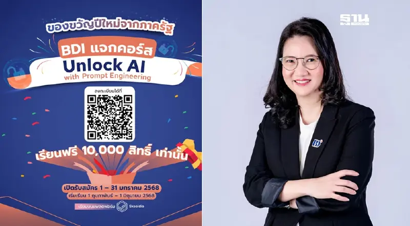 BDI มอบของขวัญปีใหม่ให้กับประชาชนทั่วไปที่สนใจอัปสกิลการใช้ AI อย่างชาญฉลาดในชีวิตประจำวัน แจกฟรี 10,000 สิทธิ์! เรียนบนแพลตฟอร์ม Skooldio