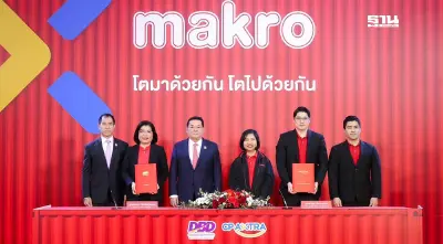 การลงนามบันทึกความเข้าใจ นำโดย นายธนิศร์ เจียรวนนท์ ประธานเจ้าหน้าที่บริหาร ธุรกิจแม็คโคร ประเทศไทย และประธานคณะผู้บริหาร กลุ่มสายงานการพาณิชย์สินค้า และ นายอรมน ทรัพย์ทวีธรรม อธิบดีกรมพัฒนาธุรกิจการค้า (ซ้ายสุด) ร่วมลงนาม