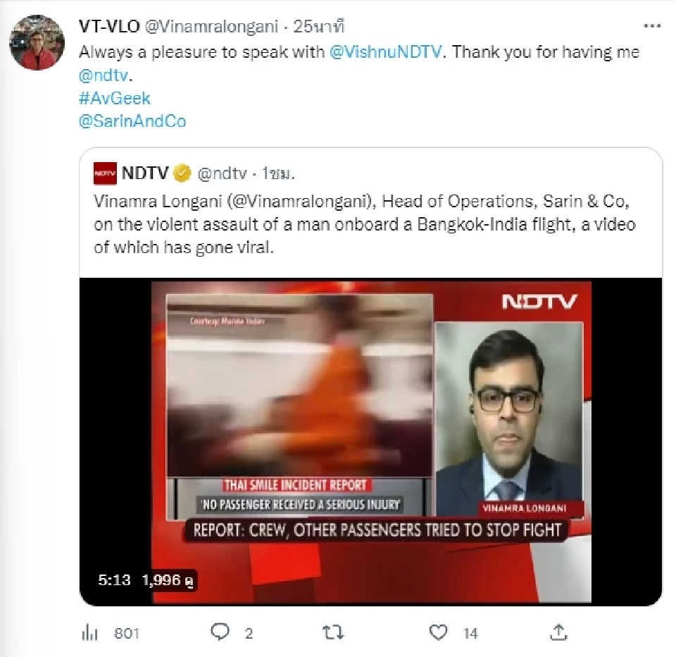 อินเดียทูเดย์ รายงานเมื่อวานนี้ว่าเกิดเหตุทะเลาะวิวาทของผู้โดยสารอินเดีย บนเที่ยวบินของสายการบินไทยสมายล์ จากเส้นทาง กรุงเทพฯ ไป โกลกาตา ซึ่งชาย 2 คนกำลังโต้เถียงกัน
